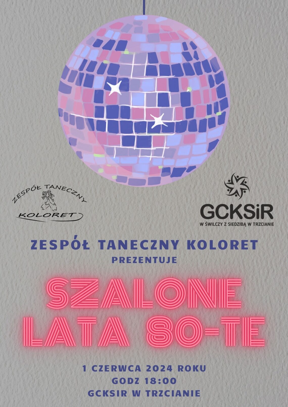 W sobotę 1 czerwca 2024 roku w Gminny Centrum Kultury, Sportu i Rekreacji odbył się niezwykły koncert Zespołu Tanecznego „Koloret” prowadzonego przez instruktor Ewę Chmaj, który przeniósł widzów w barwną epokę szalonych lat 80-tych. Scena została udekorowana w charakterystycznym stylu lat 80-tych – neonowe światła, dyskotekowe kule, fluorescencyjne dekoracje natychmiast wprowadzały publiczność w klimat tamtych lat. Już od pierwszych taktów muzyki, wszyscy obecni poczuli się jak w podróży w czasie, wracając do epoki wielkich hitów muzycznych. Można było również podziwiać na czerwonym dywanie „modelki” prezentujące modę tamtych lat. Imprezę poprowadziła Izabela Skopińska z Grupy Teatralnej Tespis.