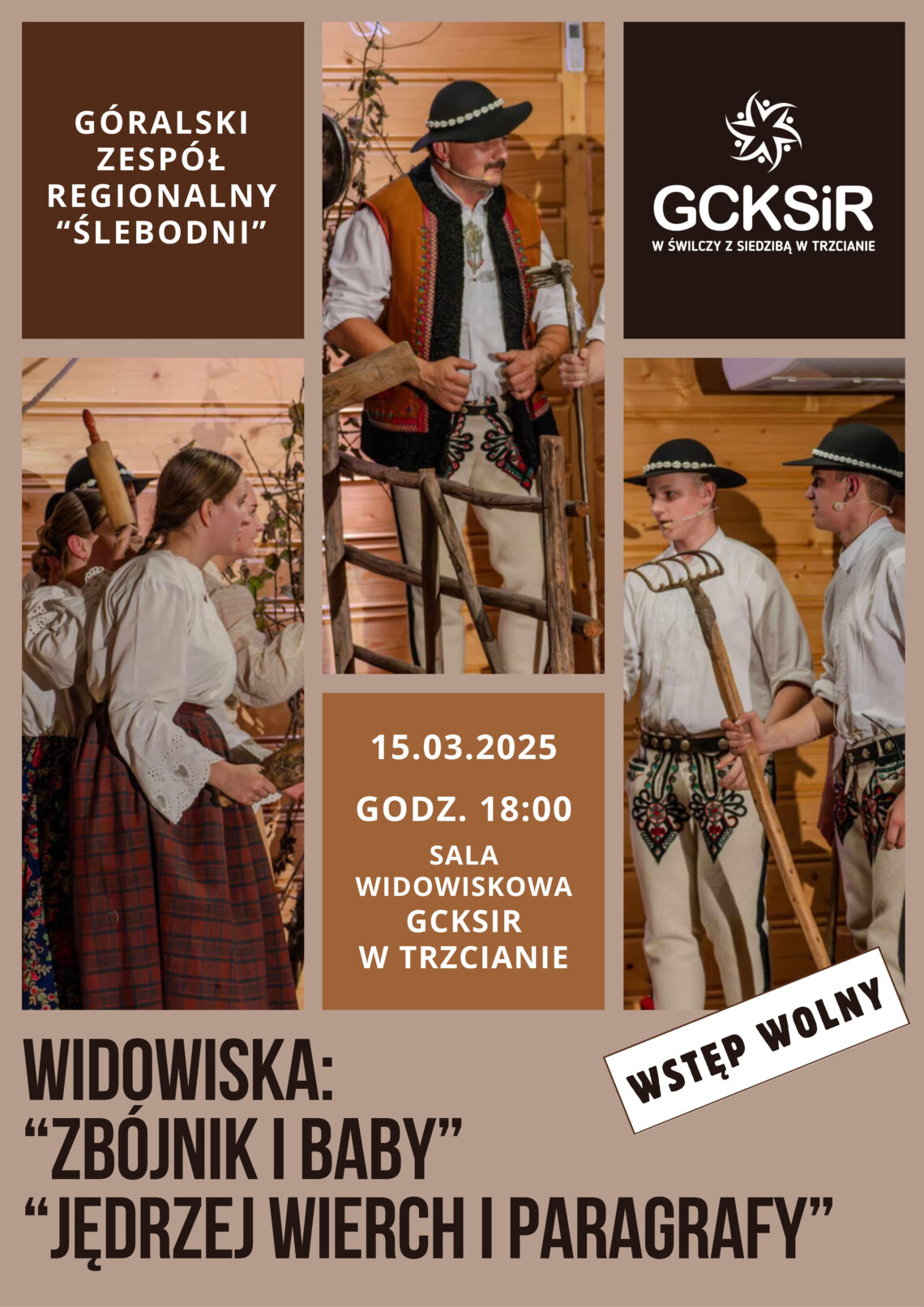 W sobotę 15 marca gościliśmy w Gminnym Centrum Kultury, Sportu i Rekreacji w Trzcianie Zespół regionalny Ślebodni, który prowadzi pani Maria Dudek. Przygotowali dwa widowiska „Zbójnik i baby” oraz „Jędrzej Wierch i paragrafy” według scenariusza Agnieszki Gąsienicy-Giewont i Joanny Łatki. Pierwsza historia to opowieść o młodych dziewczynach, które całe lato na polanie wypasały krowy i owce, i zbójniku, którego na początku się bardzo bały, ale znalazły na niego sposób. Drugie widowisko „Jędrzej Wierch i paragrafy” to opowieść o dwóch rodzinach żyjących po sąsiedzku w zgodzie, dopóki jeden z ojców nie chce wyciąć gruszki rosnącej w granicy. W niedzielę oprawą muzyczną i śpiewem Ślebodni uświetnili Mszę Świętą w Błędowej Zgłobieńskiej.